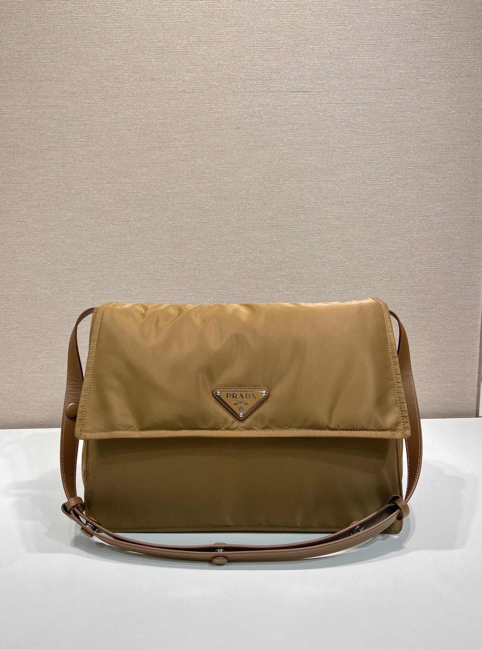 - Enameled metal triangle logo on the flap