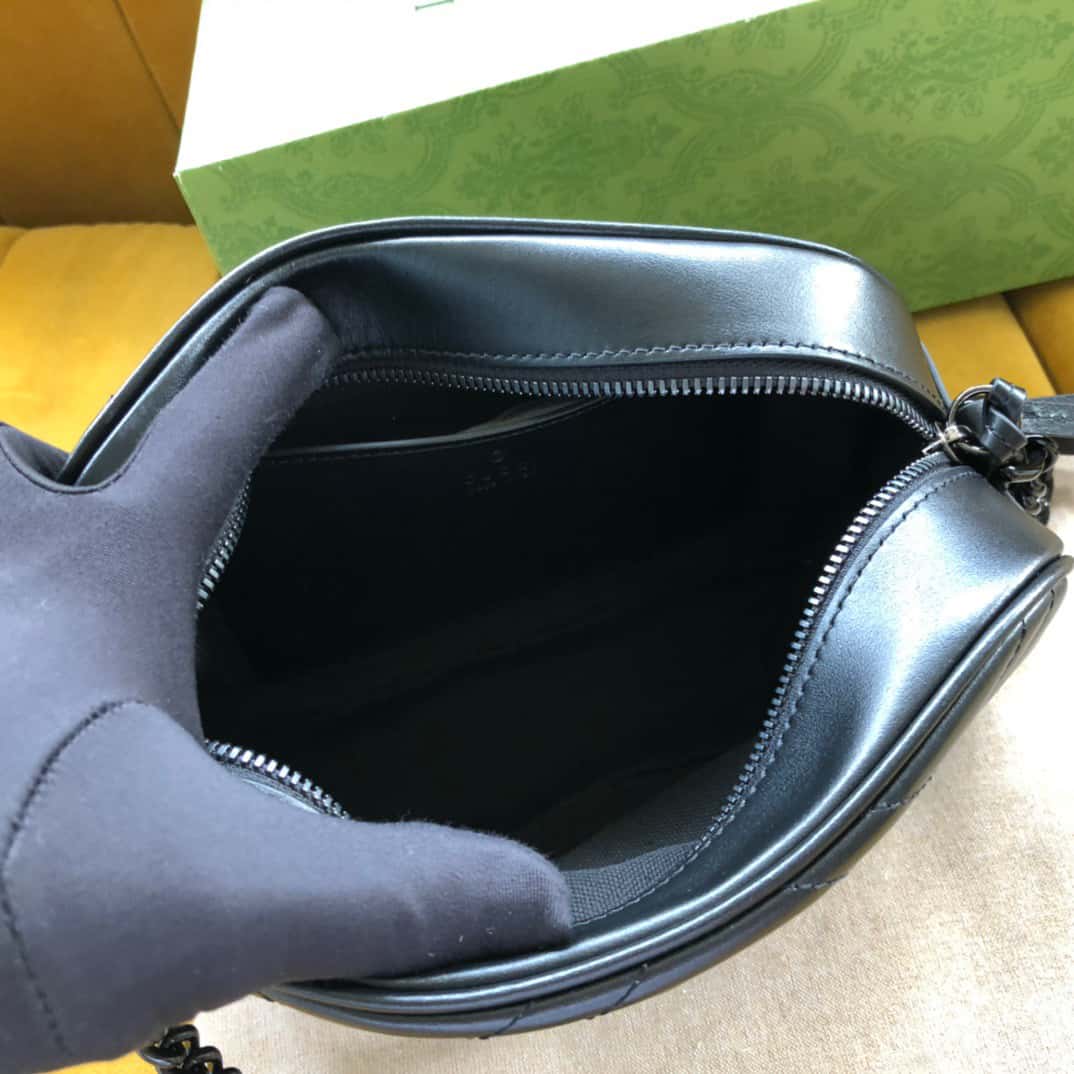 The mini GG Marmont chain shoulder bag has a softly structured shape and a zip top closure with Double G hardware. The chain shoulder strap has a leather shoulder detail. The camera bag is made in matelassé leather with a chevron design and GG on the back.