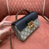 The Padlock is introduced as a mini bag in a mix of leather and canvas in different colors. Defined by its emblematic lock closure, the style is crafted from the House’s monogram canvas and accentuated by a black leather top. Adding to the styles contrasting elements, is a brown leather shoulder strap and handle. Playing with different materials and shades, the House’s designs have a hybrid feel.