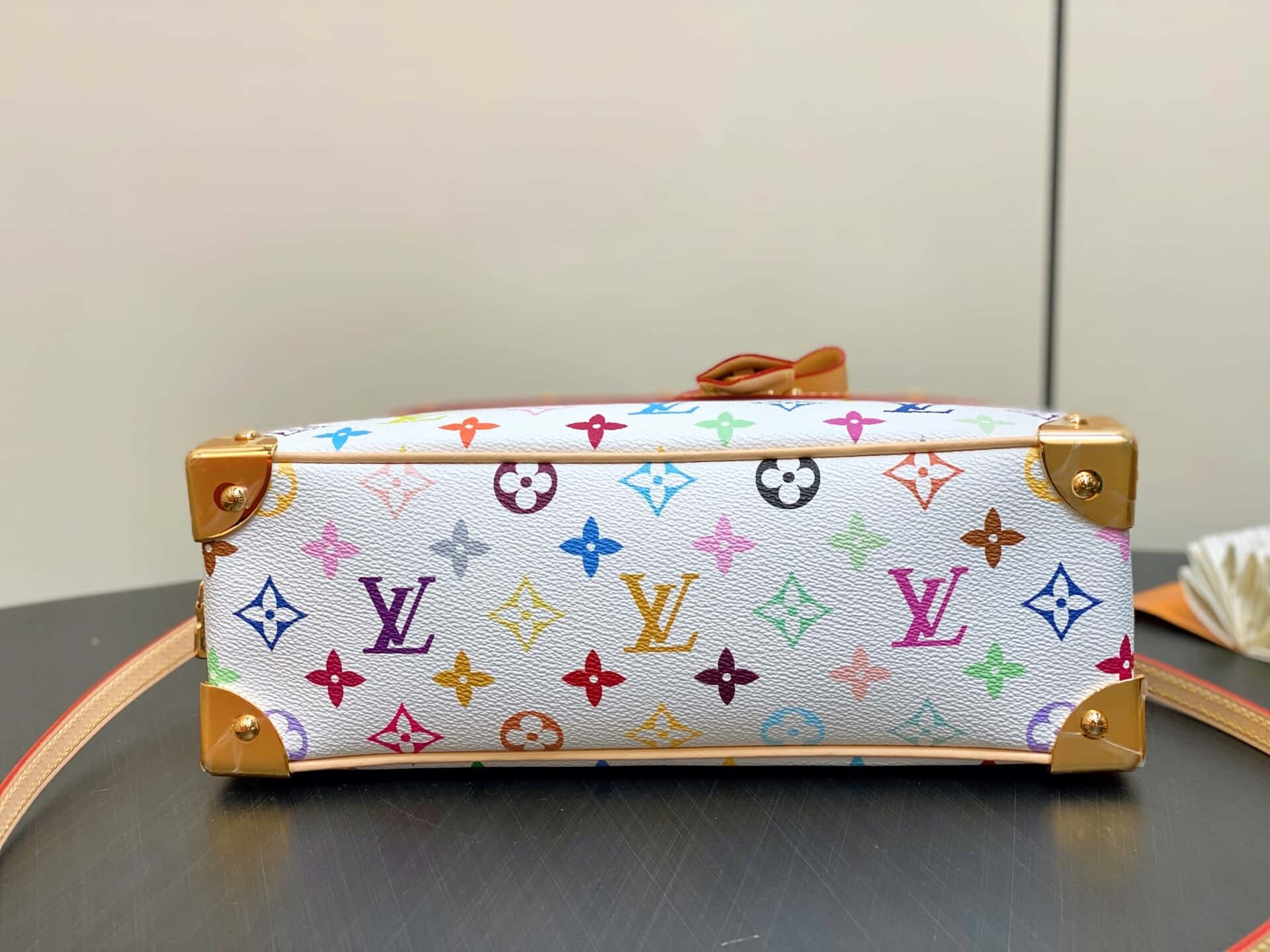 As part of the re-editon of the Louis Vuitton x Murakami collection, the Handbag East West is signed all over with a Monogram motif that has been joyfully reimagined with the Japanese artist’s signature rainbow hues. The sleek east-west design is detailed with emblematic natural cowhide leather details, including two top handles, a rebellious studded lateral band, an adjustable shoulder a removable strap and an exclusive LV x TM keybell, while golden corners nod to the House’s heritage travel trunks.