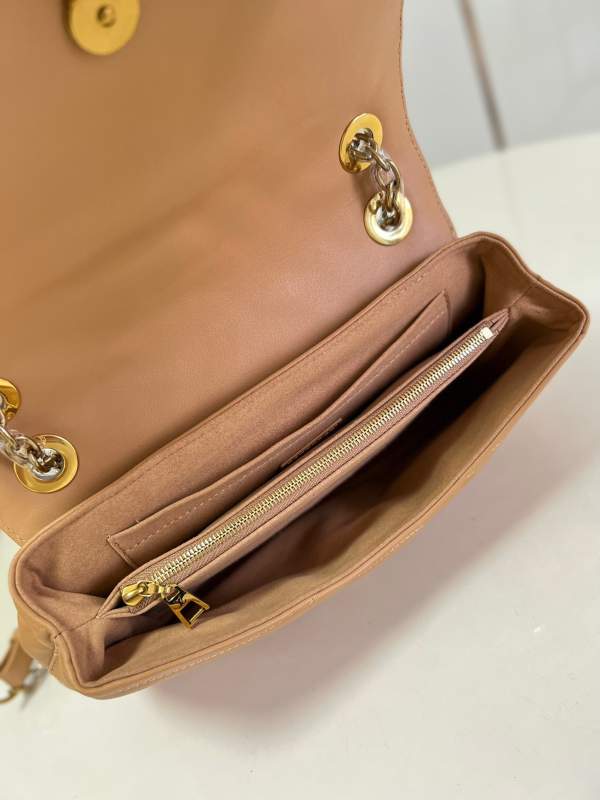 The iconic V-shaped quilting of this chain bag is redesigned in new smooth cowhide. The antiqued gold chain is threaded through the carved eyelets, and the folded gussets make it soft and close to the body. The interior features multiple compartments to easily organize women’s essentials. The recognizable LV logo is signed on the bag.
