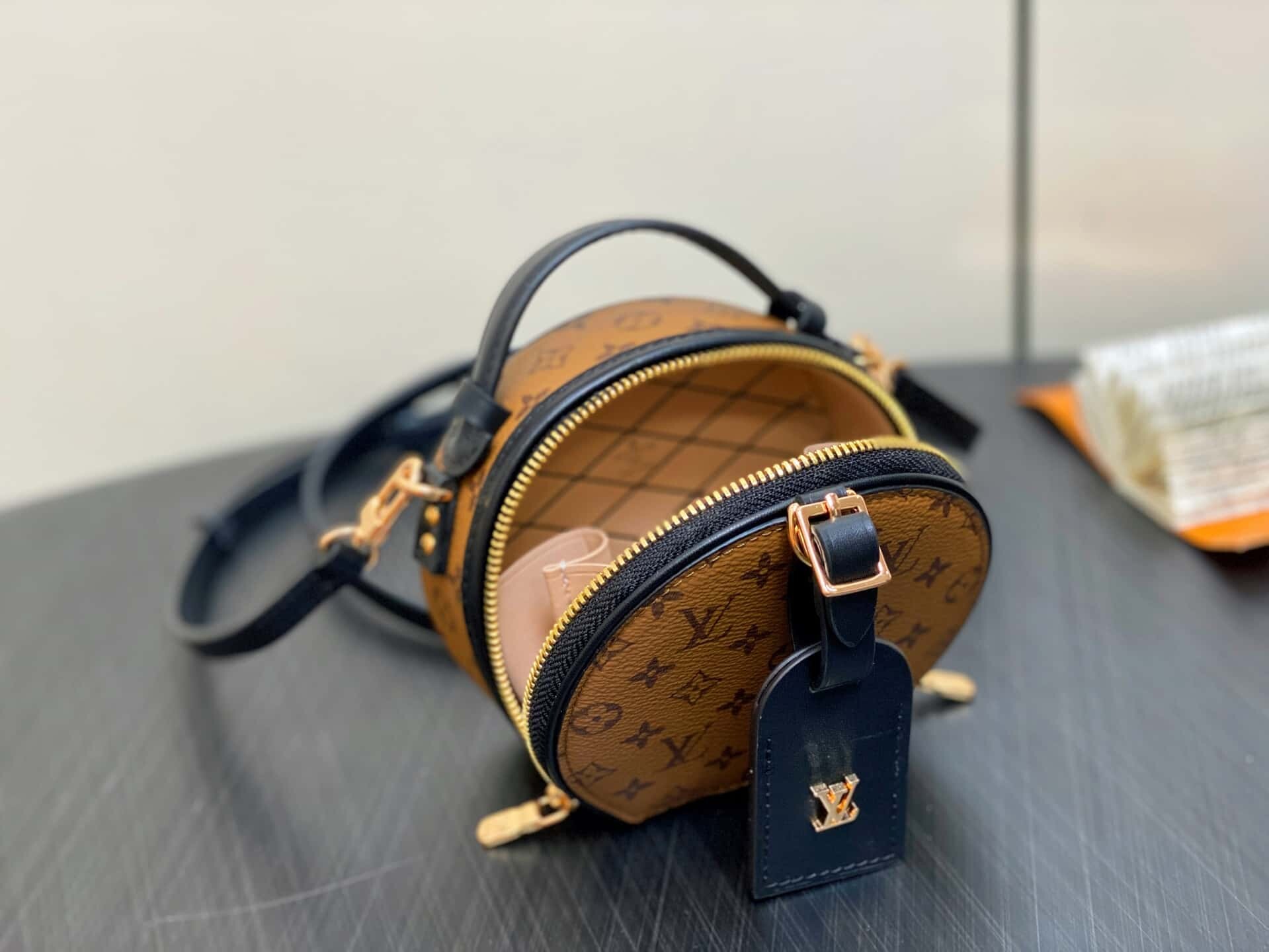The Mini Boîte Chapeau is crafted from Monogram Reverse canvas with refined calf-leather trim. This delightful mini bag evokes Louis Vuitton’s travel heritage with details such as the name tag and Malletage-pattern lining, inspired by the historic trunks. The zip closure secures a roomy gusseted compartment, while the top handle and removable, adjustable shoulder strap offer different carry options.